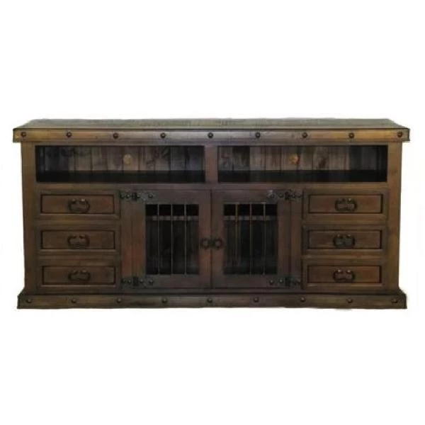 This is the largest of our Grand Hacienda TV Stands and offers plenty of storage space for your entertainment components. It comes in a variety of elegant finishes and features metal work and nail heads.
