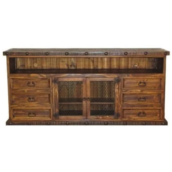 This 80″ wide TV stand is the largest of our Ponderosa TV Stands. It comes in a distressed finish and has nail heads along the trim.