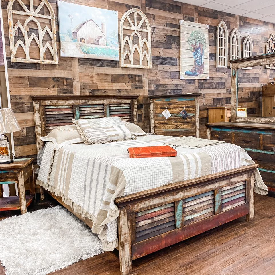 The Cabana Bedroom Set comes in a bright multicolor finish. The Bed features a shuttered headboard and footboard style. The set includes a bed, dresser, chest, and nightstand.
