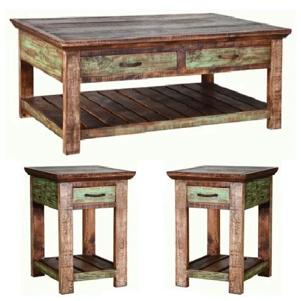 The Cabana Coffee Table Set comes in a great multicolor finish. It has drawers in both the coffee and end tables for card games and remotes. The set includes the coffee and two end tables.