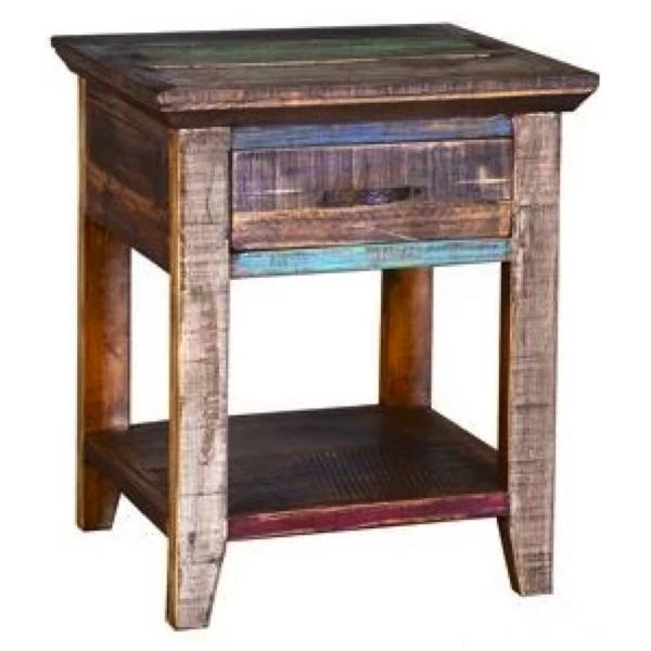 The Cabana Nightstand comes in a bright multicolor finish. It has one drawer and a shelf on the bottom.