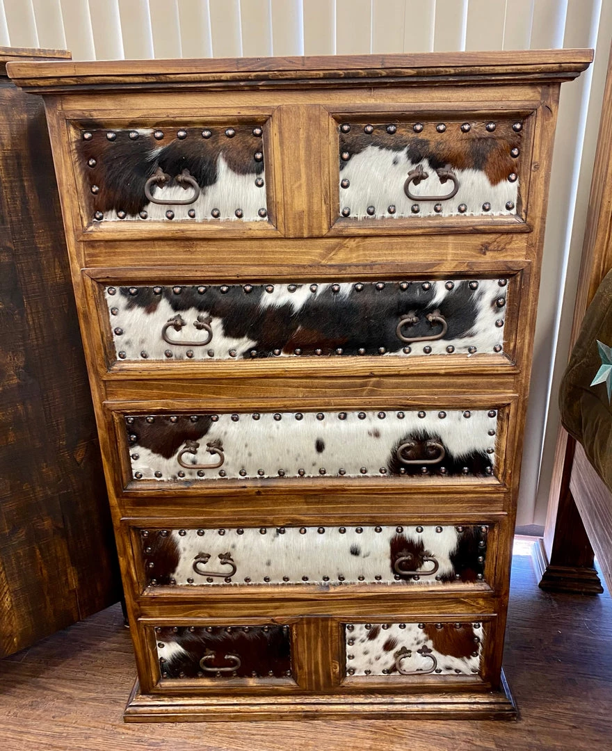 Our large five drawer chest features cowhide accents. It matches our Cowhide Bedroom set and comes in our dark wax finish.