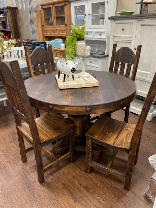 This dining set features distressed wood and nail head trim. It comes with four of our wood back ponderosa chairs. If you would like to order this table with another chair style, please call us at 479.365.2933 and we will be happy to help.
