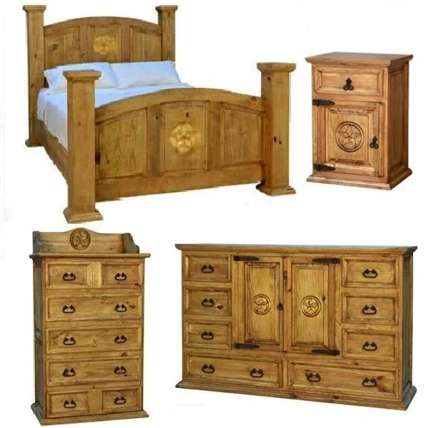 This bedroom set includes the Star Mansion Bed, mansion dresser, rustic chest, and 1 door nightstand. Each pieces features the carved Texas star for great rustic style.