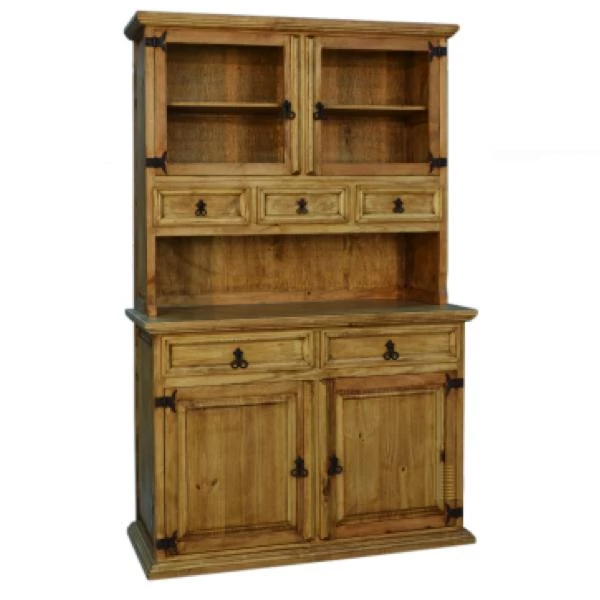 The 2 Door Hutch comes in our medium stain. It features 2 doors in the buffet and glass door top creating a beautiful traditional rustic style.