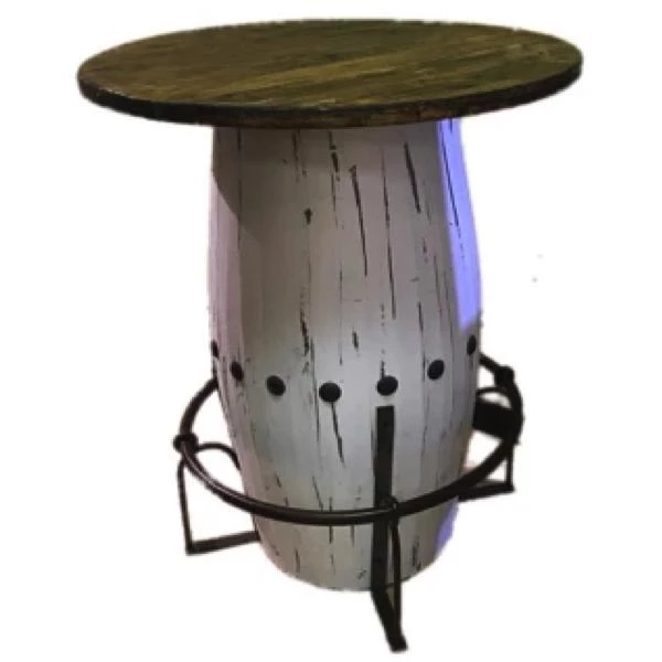 The Gatlinburg Barrel Pub Table comes in a bright white distressed finish and features metal accents. It is a great piece for small dining area and breakfast areas.