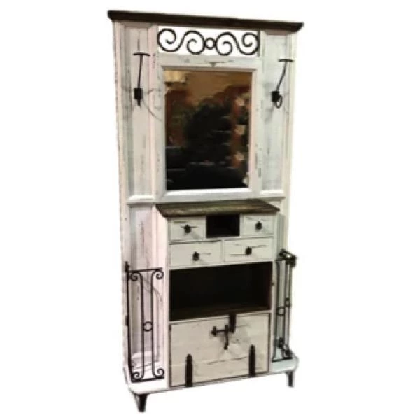 This piece makes a great entryway statement for any farmhouse style home. It comes in a beautiful white distressed finish with dark brown accents. Stylish and functional – it features several drawers, shelves, a mirror, umbrella holders and coat hooks.