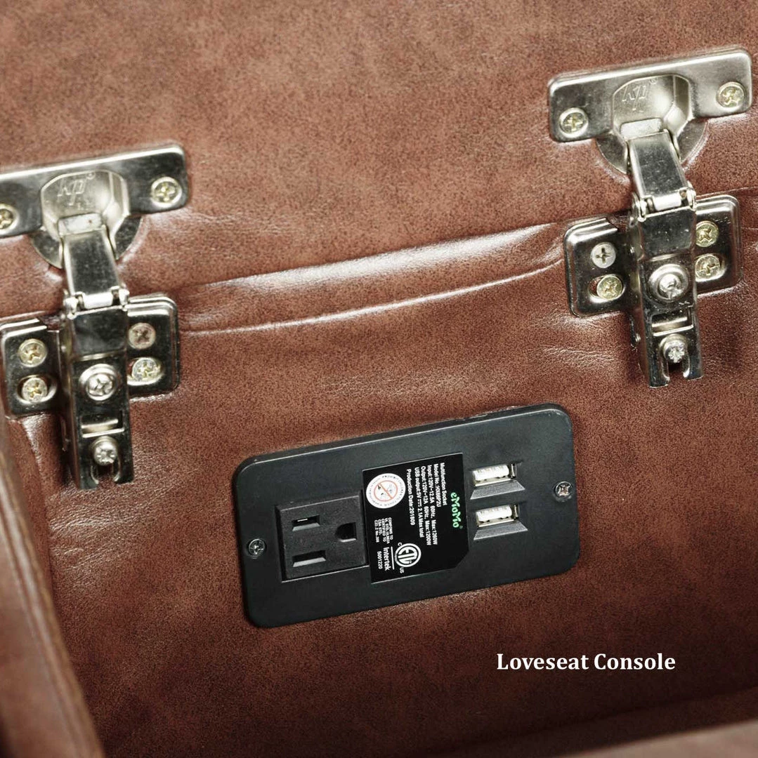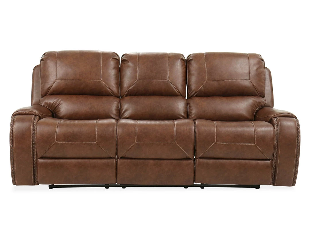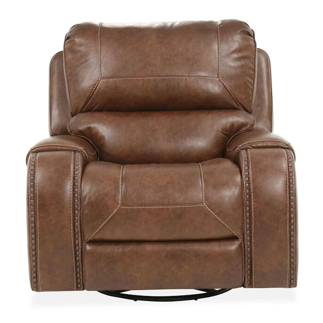Superior comfort and style are the hallmarks of this motion set. Featuring a performance cover that looks like leather with baseball stitching, this ensemble comes with a Sofa with a drop-down console & USB charging station; a Loveseat with dual rocker/recliner ends; and a rocker/recliner Chair with 360-degree swivel. Antiqued brass nailhead trim and padded arms complete this ultimate motion package. Available in Brown
