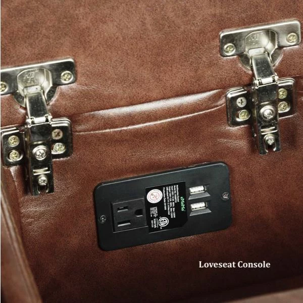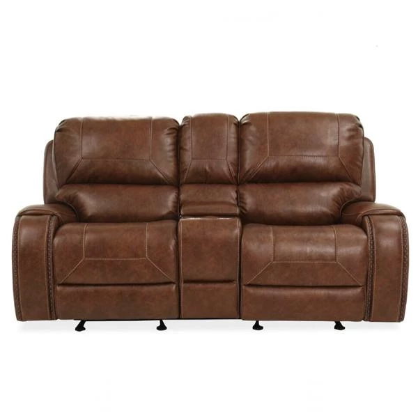 Superior comfort and style are the hallmarks of this motion set. Featuring a performance cover that looks like leather with baseball stitching. The loveseat features dual rocker/recliner ends. Antiqued brass nailhead trim and padded arms complete this ultimate motion package.