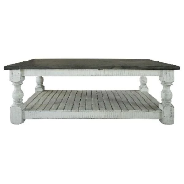 The hand rubbed white finish of the coffee table accents the warm gray top. It is the perfect piece for any living area. Pair it with our stone end or side table to finish the look.