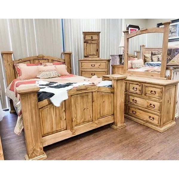 This beautiful bedroom set comes in our traditional stain. It includes a bed, medium dresser, mirror, chest, and one nightstand.
