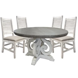 Large Table and 4 Chairs. Features magnificiently Carved Pedestal Base with Round Table Top and 4 impressive Slatted Chairs w/Ivory Finish & Fabric Seats.