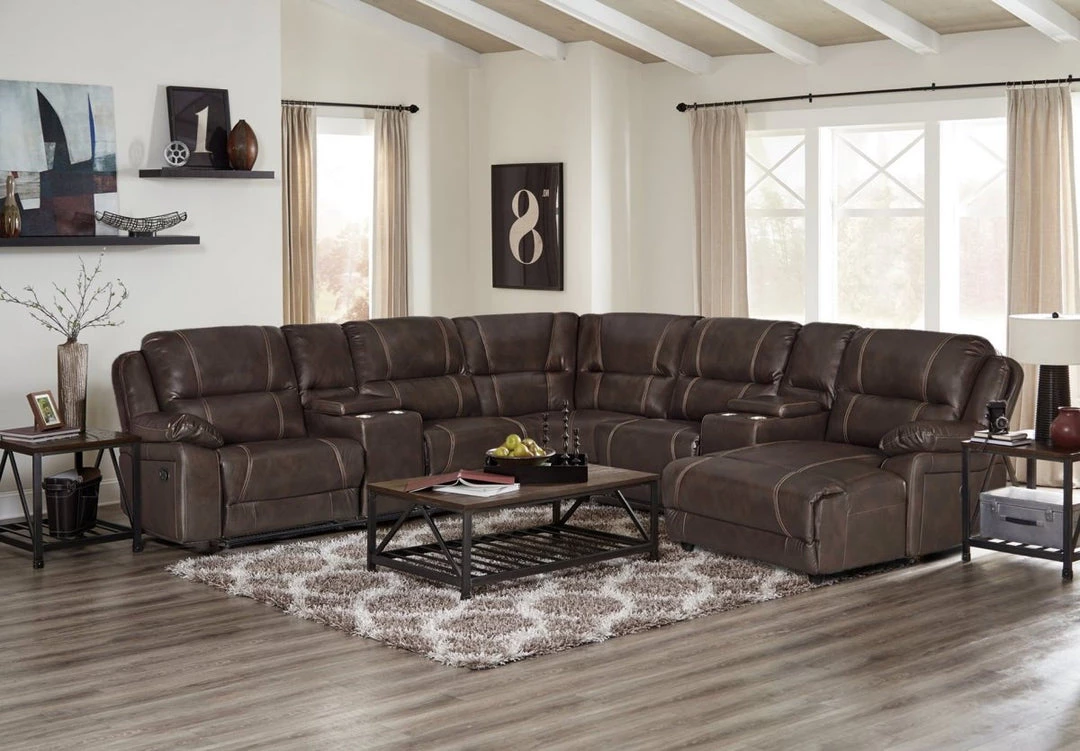 Featured in a gorgeous chocolate brown, the Laredo Reclining Sectional comes with two Recliners and with the popular lounge chair on the end. Additional features are two convenient drop down trays. This sectional is built for convenience and comfort and will be an enhancement to any living or game room area. Top of the Line Sectional.